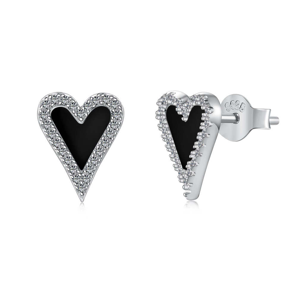 Black Agate & Silver Heart Stud Earrings